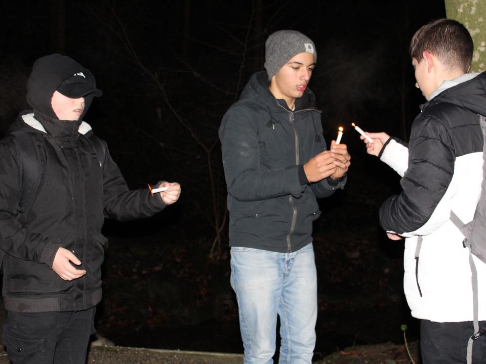 Am Donnerstagabend, 12.12.2019, fand der Adventsanlass unserer Firmgruppe statt. Als die Schüler/innen von Wängi am frühen Abend von Zürich zurückkamen, wurden sie am Bahnhof bereits erwartet. Ohne einen Zwischenstopp ging es direkt weiter zur Feuerstelle ins Hexentöbeli, wo wir in drei Gruppen aufgeteilt wurden. Während dem folgenden Postenlauf wechselten unsere Aufgaben zwischen dem bekannten Spiel „Tabu“, einer Fotosession, bei welcher wir mit dem Licht unserer Taschenlampen versuchten Symbole zu kreieren und einer Stafette mit Kerzen, die an einen Baum gesteckt wurden. Direkt im Anschluss gab es Würste vom Grill mit feinem Punsch dazu, um uns bei dieser klirrenden Kälte wieder etwas aufzuwärmen. Zum Abschluss warfen wir alle nacheinander einen Zettel ins Feuer, auf welchem etwas stand, was uns momentan sehr bedrückt, um uns in der Weihnachtszeit auch davon zu trennen. Damit nahm der Abend einen ruhigen Abschluss und wir verabschiedeten uns voneinander, um nach Hause zu gehen.